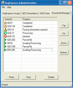 The purpose of the GEO integration tool is to provide a convenient means for the local analysis of remote publicly available experiments. As the tool is designed for convenience, as much of the data retrieving, file parsing and database loading process is automated. Where possible a ‘one-click’ access approach is adopted, so that associated data files (e.g. annotation or platform files) are retrieved automatically and database configuration rules are used for parsing. In situations where choices have to be made (e.g. selection of values in experimental data files, choices on which annotations are required), simple wizards are provided. Information about relationships between the different annotation types is used to provide automatic mappings of identifiers. For example, if a platform file has Unigene identifiers, then the GO terms for each entry will be resolved at run time (by matching the platform row id to the Unigene cluster, then to the corresponding set of LocusLink ids, and finally to the Gene Ontology terms). |