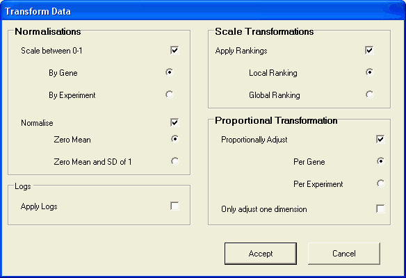 The transformations can be specified using the dialog from the data/transform menu. The transformation are applied in the following order: normalization,proportional adjustment,log.