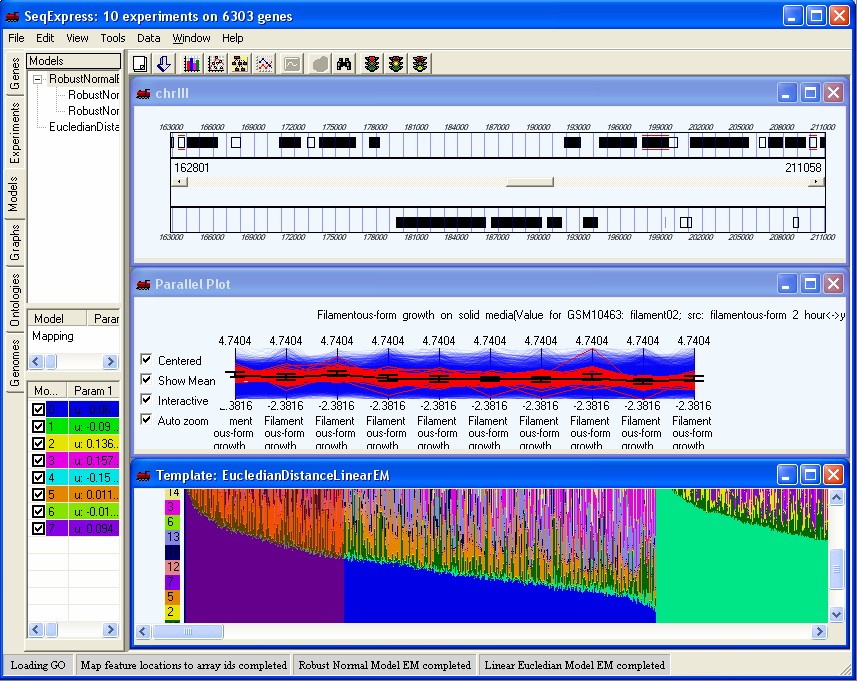 Showing a SeqExpress session, where a series of models have been used to analyse the data. The expression profiles and genome locations of genes that best fit one of models have been selected.