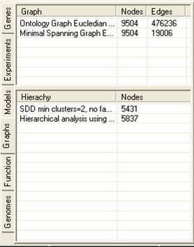 The graph tab contains information about graphs and hierarchies that have been constructed using the experiment data. A number of different graphing and hierarchical analysis methods are available, and the results of these are placed in the tables in the graph tab. By selecting the popup menu in either table it is possible to remove or rename items. It is also possible to generate clusters from either the hierarchies or graphs (the methods for doing this vary considerably). Hierarchies can be visualised as dendograms.