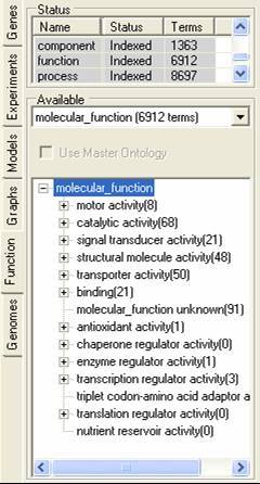Different functional descriptions can be selected using the middle option menu, and can optionally be associated with a master (or mapping) ontology. The functional descriptions can be browsed using the bottom navigable tree. By selecting the popup menu in the lower tree the functional element and its relationships can be viewed, and all associated genes can be saved to the gene tab.