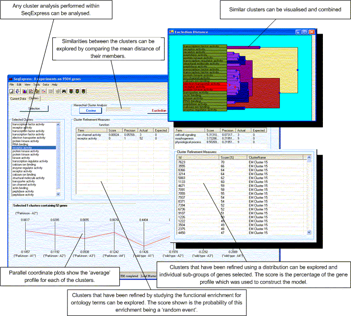 This tools is designed to give an indication as to the biological behaviour of the clusters found by SeqExpress. Some behaviours are relatively simple to ascertain by simple geometry (for example cyclic behaviours), however most genes have a complex involvement in the governing of cellular machinery and so further analysis is needed.