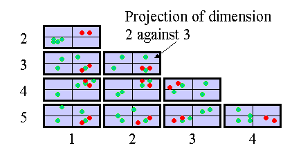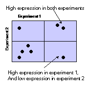 By plotting 2 dimensional slices through an n-dimensional space, we can project complex multi factorial information onto a 2 dimensional display. N-dimensions can be projected down onto sum(n-1) plots. By applying brushing to these plots it is possible to use them to identify correlations in other dimensions. In the illustration below all the genes that are highly expressed in experiments 1 and 2 have been selected, and have been shown in red. It is then possible to see how these genes behave in all the other experiments.