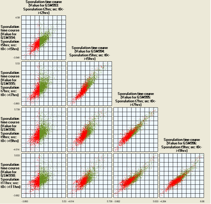 In SeqExpress when choosing to view a scatter plot it is possible to select a sub set of experiments (or concept defined projections) to display For example below shows the results of a 5 time series data experiments, with all the genes that have low expression levels at 2hrs selected. It is possible to see how over time the patterns of the genes expressed changes, whilst there are general correlation between the different gene expression profiles, the outliers and major transitions can be seen (the significant shift from 2 hrs to 5 hrs).