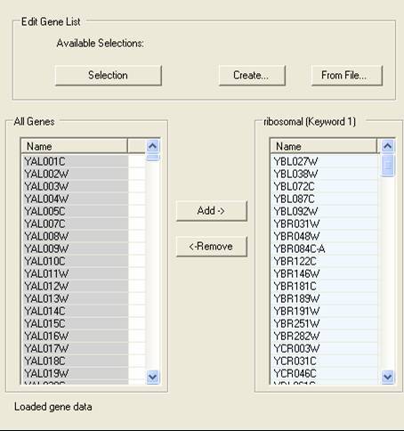 It is possible to edit the individual genes in a selection by using the Gene List Editor option. This allows for the direct addition or removal of genes from a specific group. By using the Selection button at the top of the editor it is possible to choose the selection to be edited. The genes that are in the chosen selection are shown on the right. Genes are added or removed from the selections using the controls at the bottom of the dialog. A new selection can be created by select the Create button, and list of gene identifiers in an external file can used to generate a selection by using the From File... button..