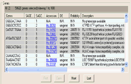 Navigation buttons at the bottom of the Genes table allow for paging through the subset of genes. Items that are selected within this table can be saved as separate collections, this is done by using the 'copy selected' item in the Edit menu.