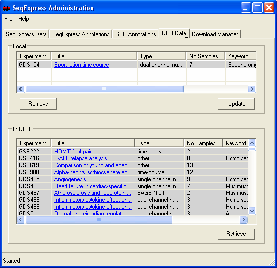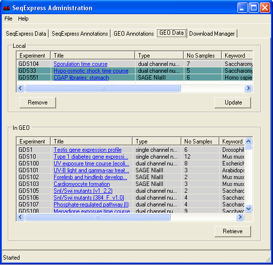 To request for assay information to be loaded into SeqExpress, select the 'GEO Data' tab and choose the required series or data set from the bottom list and press the retrieve button (in this example below GDS551 and GDS33 are retrieved).