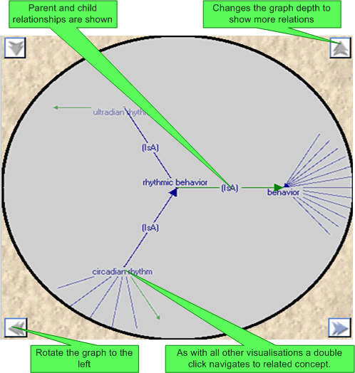 A 'semi' fish eyed view graph is provided to show the interrelationships between the current concept and all its children and parents. The directionality of a relationships is indicated by both the colour and direction of the interconnecting arrows. The graph details can be changed using the up and down arrows.