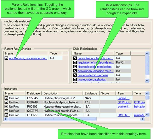 Details about the specific concept, it's child relationships, it's parent relationships (inverse relationships), and any associated protein instances are shown in the list view. It is possible to toggle relationships on/off using this view. If a relationship is toggled off then it will only be shown in the list view and the main navigation pane on the left-hand side of the SeqExplorer window, the relationship will not be used in any score calculations and will be ignored if the ontology is exported to OBO format.