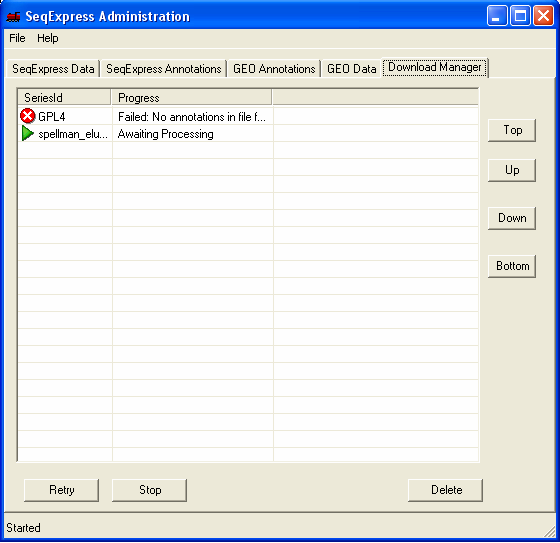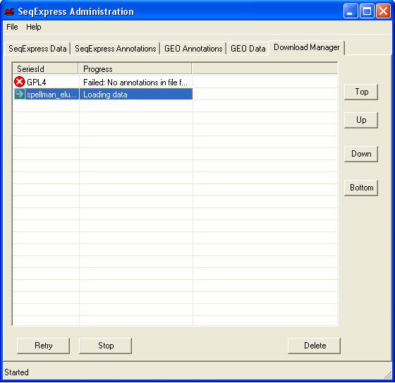 The information in the file is now loaded into SeqExpress, and can be opened using the File->Import menu. The available experiment data can be deleted from the SeqExpress server using the Delete button under the SeqExpress Data tab.