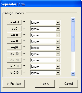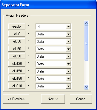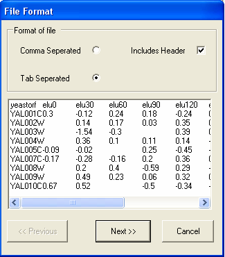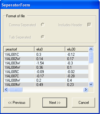 In this case the first column contains the ID for the gene, and all the other columns contain data. It is possible to change the name of the column by clicking the corresponding column button, in this case this is not needed. The name of the column corresponds to the type of ID that is being imported. The image below shows that the ID column contains 'yeastorf' identifiers and is the first column, all the other columns contain experimental data. You should select NEXT when you have filed in the form.