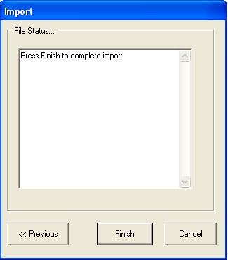 Selecting FINISH will start the import procedure, any errors that occur will be reported in the text box (for example if you are importing experiment data and the Ids are not unique).