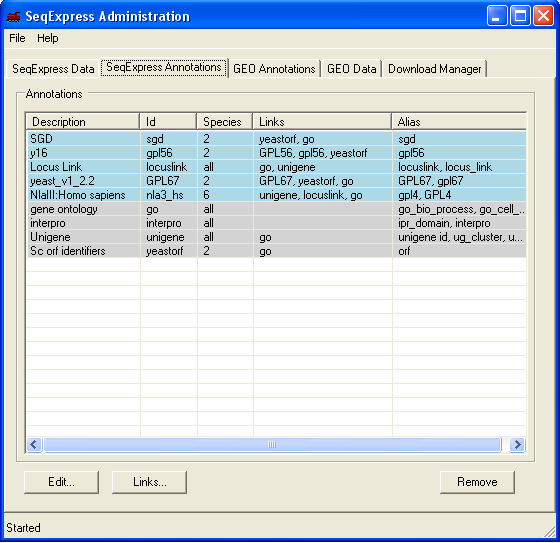 In this example Genbank Identifiers for all locuslink entries will be imported, this is done by importing information directly from the NCBI locuslink to GI mapping file. Once loaded, it will be possible to directly lookup individual genbank entries from a corresponding locuslink entry. The currently loaded annotations can be viewed by selecting the SeqExpress Annotations tab.This shows the:
