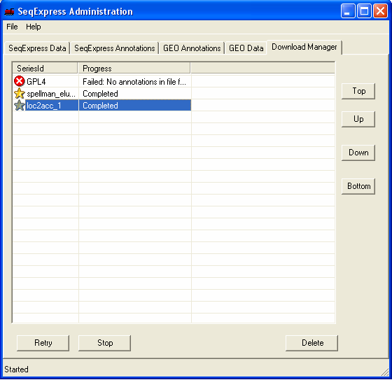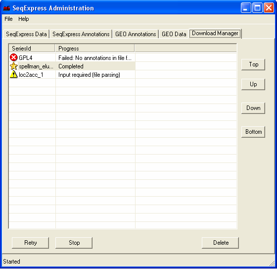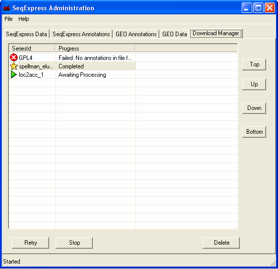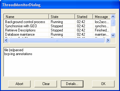 A monitor tool is available which allows you to view the current state of any subprocesses that are running in SeqExpress (also provides any error/status information). This can be accessed from the File->Monitor.. menu. This tool is for general interest, and is not needed to use SeqExpress.