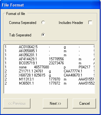 In this example the file is tab separated, but does not contain a header line (so the includes header check box should be unselected). Select Next to continue.