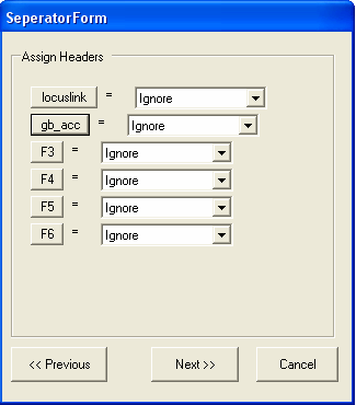 The file is formatted correctly, so you should select the Next button. Information about the type of each column needs to be specified. As only annotation information is being imported, it does not matter if the Id column is unique.The first column contains LocusLink identifiers, so we need to chang the name of the column from F1 to 'locuslink' (we can alternatively use one of the aliases in the SeqExpress Annotations tab that have been defined for locuslink).To change the name of the column select the 'F1' button.