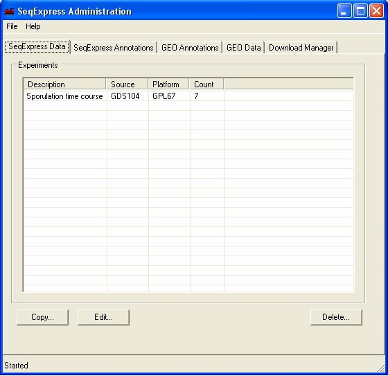 Once SeqExpress has been installed you should start the GEO Tool, from Start->Programs->SeqExpress->GEOTool. Depending on the server version, when the tool is first started a notice may appear informing you that an update is occuring. Additionally once updated a preliminary maintance check is started, it is recommended (but not essential) that you always run the check when you start the tool. When the tool starts you will be shown information about: SeqExpress Data: what experiments are currently loaded into SeqExpress. SeqExpress Annoations: what (gene) annotations are currently loaded into SeqExpress. GEO Annotations: what annotations (for the various array platforms) are available from GEO. GEO Data: what experiments are available from GEO. Download Manager: what files are currently being retrieved, parsed or loaded into SeqExpress By default one set of experimental results is loaded into SeqExpress, as well as annotations from a variety of databases (SGD, LocusLink, Human SAGE tags, GO term etc.)