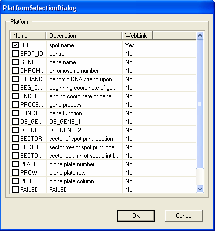 To make a choice as to which data to import double click on the item. A dialog will appear allow you to select the data items to be imported (in GEO series this will be the columns of data, and for GEO Platforms this will be the annotations). In this case the default options are fine, so you should select the OK button to continue the import procedure.