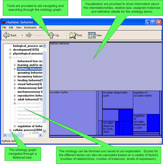 SeqExplorer is an add-on to SeqExpress which allows for the visualisation, scoring and browsing of complex ontologies, specifically the Gene Ontology. It provides a number of visualisation tools for the analysis of interrelationships within the ontology, examination of scores associated with concepts (e.g. number of assigned instances), viewing and editing of the specific concept details and concept similarity comparison (for the identification of possible errors). Data importing, scoring and searching tools are also provided.