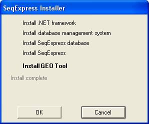 Another screen will appear, after which SeqExpress will start to install. When it has completed the installation, select the close button. The GEO Tool will now be installed, this is the final task. Once the task are completed the installation will show the 'install complete' message.