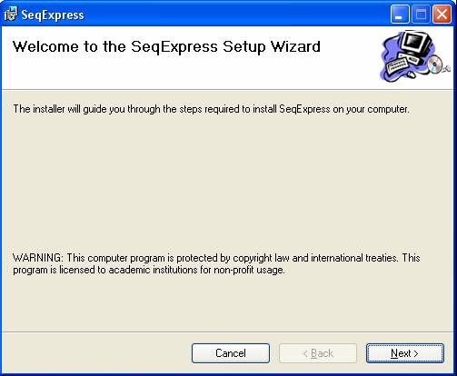 Run the seqexpress installation file, this will unpack the distribution and start the installation. If .NET is installed then the main dialog for the installation will now appear, you should select the next button.
